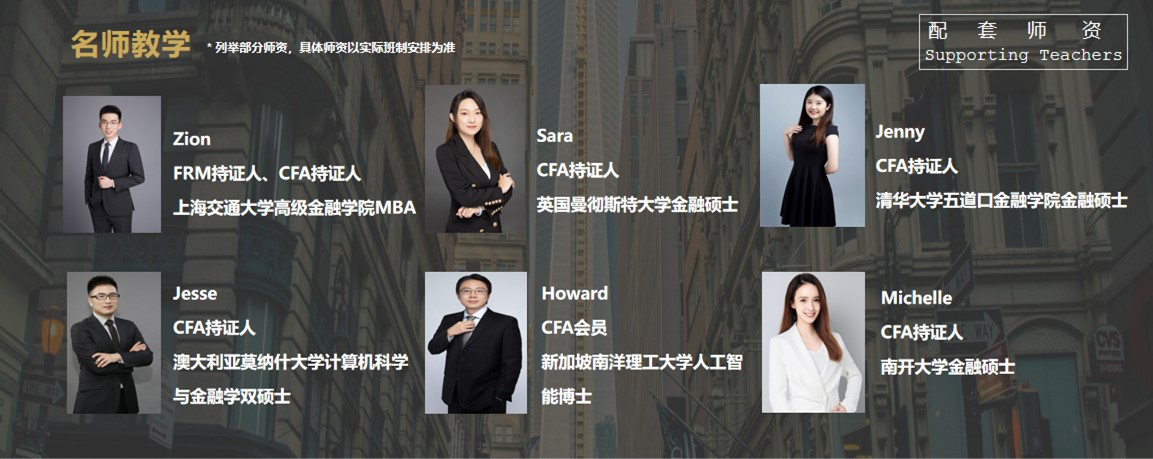 教学师资】-名师配置,经验丰富,职业讲师团队提供专业教学服务。 CFA校内班的师资配置,从全球招募各个金融领域的优秀讲师,要求具备国内外顶尖院校硕士以上学历,具备摩根、中金等世界500强企业工作从业经历,有5年以上教学经验的职业讲师。