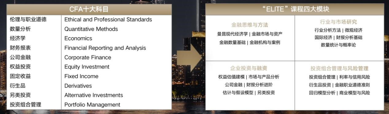 课程体系】-学练结合的模式,适合零基础学生。通过CFA十门科目的学习,同学们将拥有全面的国际化的金融领域专业知识,同时有利于学习者充分准备考研初试专业课。纯英文课程,中英双语授课,助力英语水平提升。本科期间通过 CFA证书一级考试,也将为求职与职业晋升增加筹码。