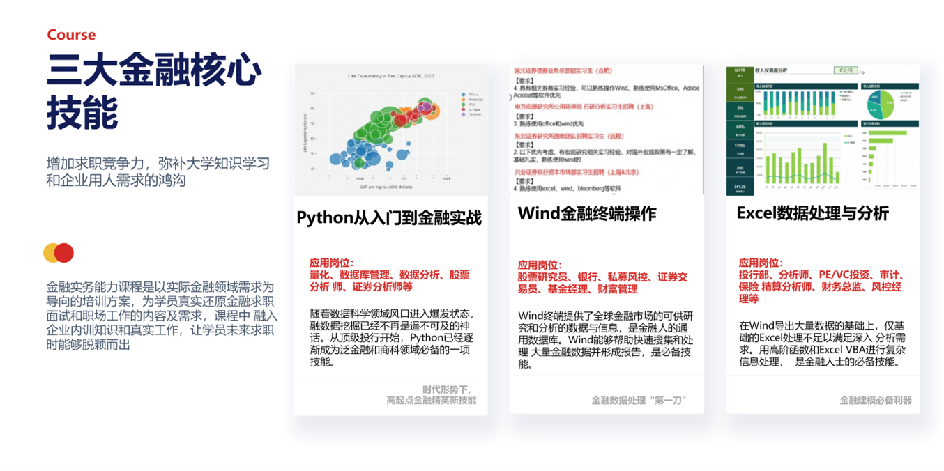技能加持】-掌握 Python、Choice、Excel,“驾驭”数据分析能力金融行业最核心的3大实务技能-EXCEL数据分析,Choice金融终端使用,python金融数据分析。在数据爆炸的时代,掌握数据获取能力、数据处理能力及数据建模能力,是金融菁英在瞬息万变的金融行业保持竞争力的策略之一。