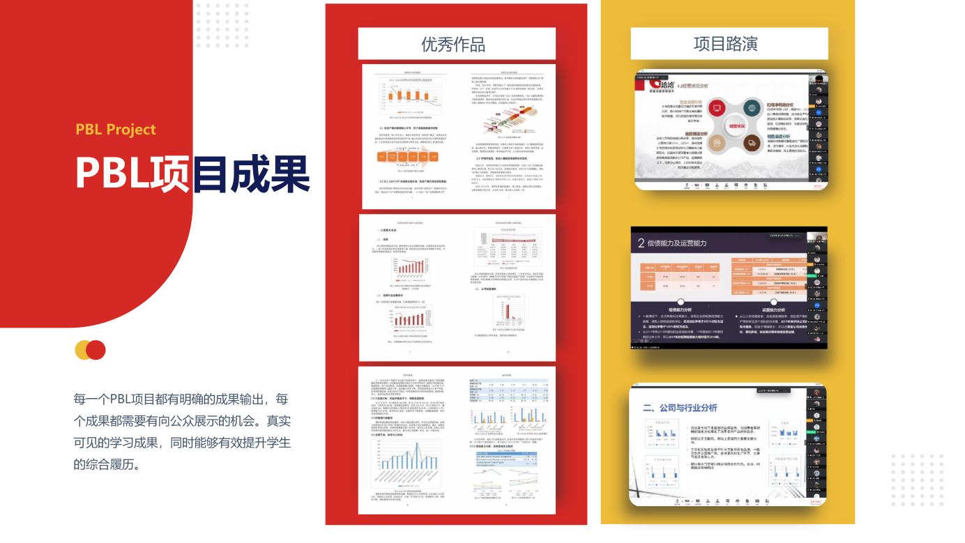 实践能力】-“沉浸式”金融项目制学习方法,快速提实操能力。完成4个PBL 项目学习,包括企业战略咨询、行业研究、企业投融资、决策组合管理与风险管理。最终完成成型的项目研究报告等成果物,这些成果将可助力求职、升学、参加比赛、甚至投入生产。
