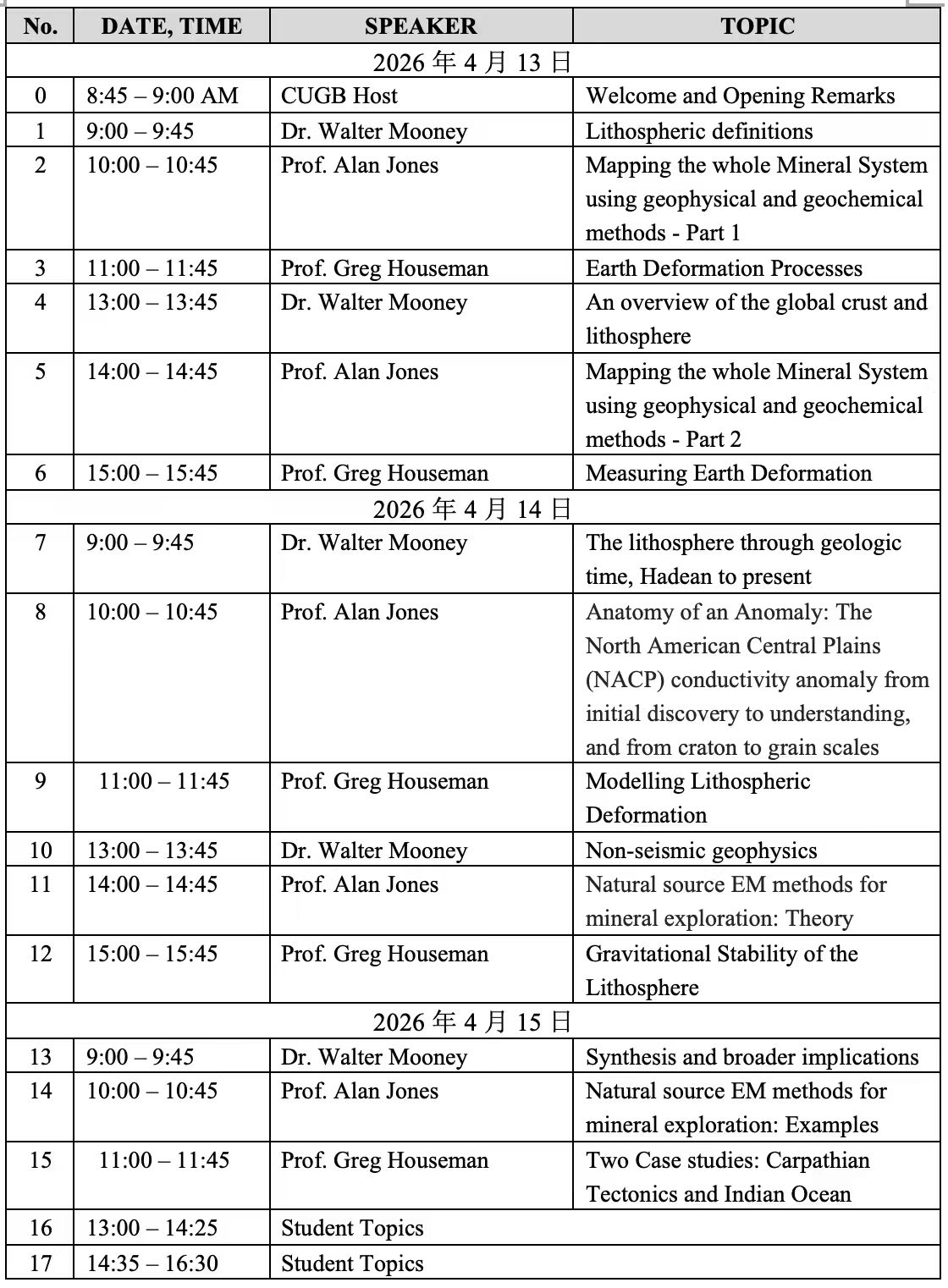 课程题目:Lithospheric Structure, Physical Properties, Deformation and Mineral Resources
