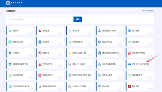 2、进入系统直通车栏目,点学生电子材料申请系统