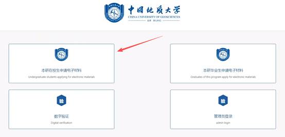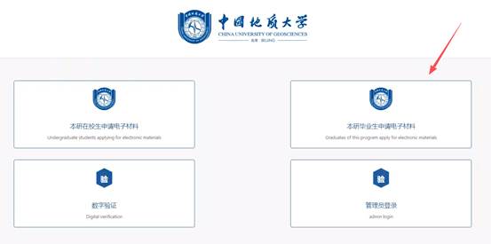3、进入申请页面[url=]点“本研在校生申请电子材料”模块[/url],[url=]进去后绑定邮箱完善资料,即可根据需要申请材料。[/url] 注:本研都在地大的同学可通过页面上方选项转换身份