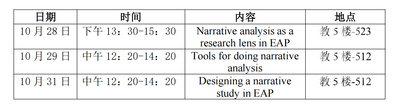 应外国语学院邀请,美国夏威夷大学Christina Higgins教授来我校进行学术合作与教学交流,并作教学研究工作坊。 主题:Narrative Analysis as a Research Lens in EAP (English for Academic Purposes) 时间:2025年10月28日-31日 地点:教五楼 工作坊内容及时间安排如下: 工作坊简介:
